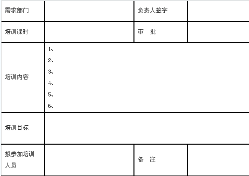 在明确了企业内训的目的与对象后,就需要进一步明确培训需求。企业培训目的仅仅是大致界定了内训的范围,但具体的培训内容需要进一步细化,这样内训才更具有针对性。内训需求信息主要来自于将来接受企业内训的对象。具体做法是,先由公司人力资源部培训专员向相关部门发放《企业内训需求调查表》,调查表示例如下。
