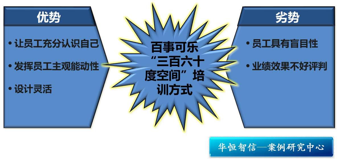 每个企业都有每个企业对于人才培养的策略。但对员工的培养越来越有针对性几乎是所有企业人才管理的普遍做法。百事可乐同样遵循有针对性地培养员工,但是其不是采用普遍的前期对员工进行测评,主管或专门人员根据员工的个体状况进行个性化培训的设计,而是采用十分独特的“自主性培训”的培训方案,提倡和鼓励员工主动把握自己的职业发展方向,自己设定培训需求和计划,而公司作为一个平台,尽可能地帮助员工。针对百事可乐如此独特的“三百六十度空间”培训方式,我们来分析一下这种策略的优劣势。