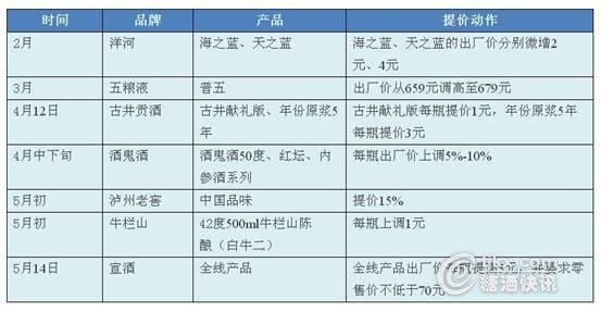上面这个表格比价详细的统计了今年上半年知名酒企提价的一些动作,酒企提价动作频频,同时也主要是对企业核心产品进行的提价,显示出在经历系列调整之后,酒企在今年普遍表现出了提价的勇气和信心,也从一定程度上反映出,企业对于行业的积极性判断。