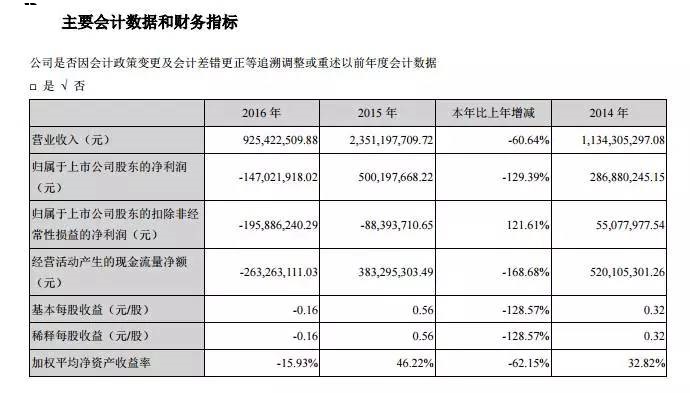 4月11日晚,上海百润投资控股集团股份有限公司发布2016 年年度报告,报告显示:2016年度,公司实现营业收入9.25亿元,同比减少60.64%,净利润亏损1.47亿元,同比减少129.39%。