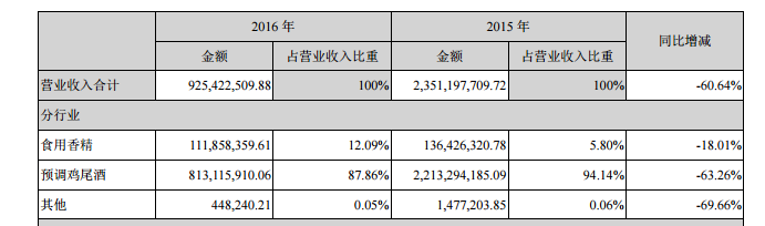 其中,预调鸡尾酒2016年营业收入8.13亿元,同期减少63.26%。主营业务收入占比较高的预调鸡尾酒业务在消化经销商库存过程中,公司端产品出货量显著低于终端产品销量,导致公司营业收入减少。