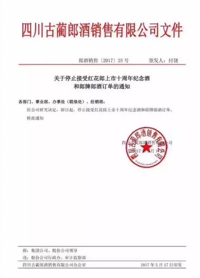 第一份通知表示,即日起将停止接受红花郎上市十周年纪念酒和郎牌郎酒订单。
