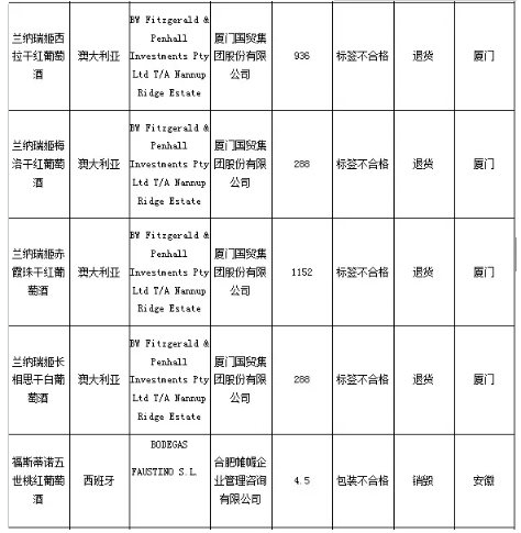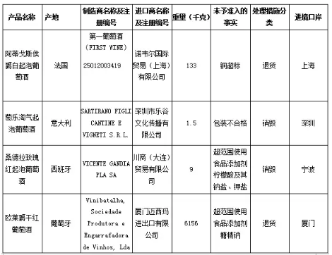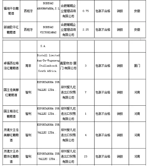 (本表所列进口不合格进口葡萄酒信息仅指所列批次酒类。表中所列批次进口葡萄酒问题是入境口岸检验检疫机构实施检验检疫时发现的,都已依法做退货或销毁处理。这些不合格批次的进口葡萄酒未在国内市场销售。)