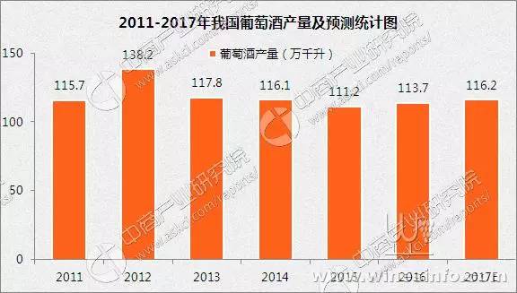据中商产业研究院发布的《2017-2022年中国葡萄酒市场现状分析及行业发展趋势预测报告》数据统计显示:2016年中国葡萄酒产量113.7万千升,预计2017年我国葡萄酒产量将到达116.2万千升。2011-2017年我国葡萄酒产量具体数据如下图所示:
