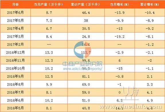 2016-2017年葡萄酒产量及增减变动月度数据表