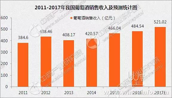 从近几年我国葡萄酒的销售收入分析,2011年中国葡萄酒行业销售收入384.6亿元,一直稳步增长;2016年我国葡萄酒行业销售收入增长到484.54亿元,预计2017年我国葡萄酒行业销售收入将达521.02亿元.