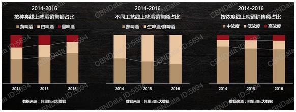 整体而言,啤酒销售呈现集中化趋势。2016年,从种类上来看,销售额占比最高的黄啤优势愈发突出;从工艺上看,生啤在线上逐渐成为消费者选择较多的啤酒;同时,目前市场上中浓度啤酒还是主流消费趋势,但近两年低浓度啤酒线上市场份额上升较快,成为潜在消费趋势。