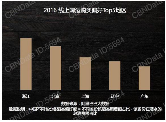 浙江、北京、上海、辽宁和广东是最喜欢在网上买啤酒的五大地区。