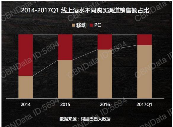 数据显示,越来越多的人选择从手机端选购酒水。2017年第一季度,超过八成的线上酒水销售额来自移动端。