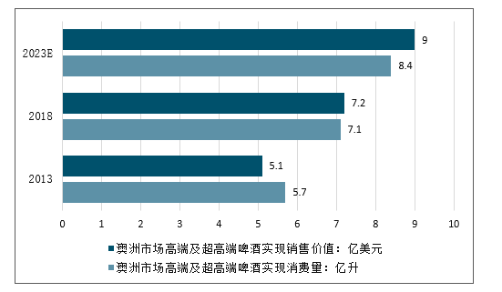 2018年澳洲市场高端及超高端啤酒实现消费量7.1亿升,实现销售价值72亿美元。预计到2023年,消费量将达到8.4亿升,消费价值将达到90亿美元。