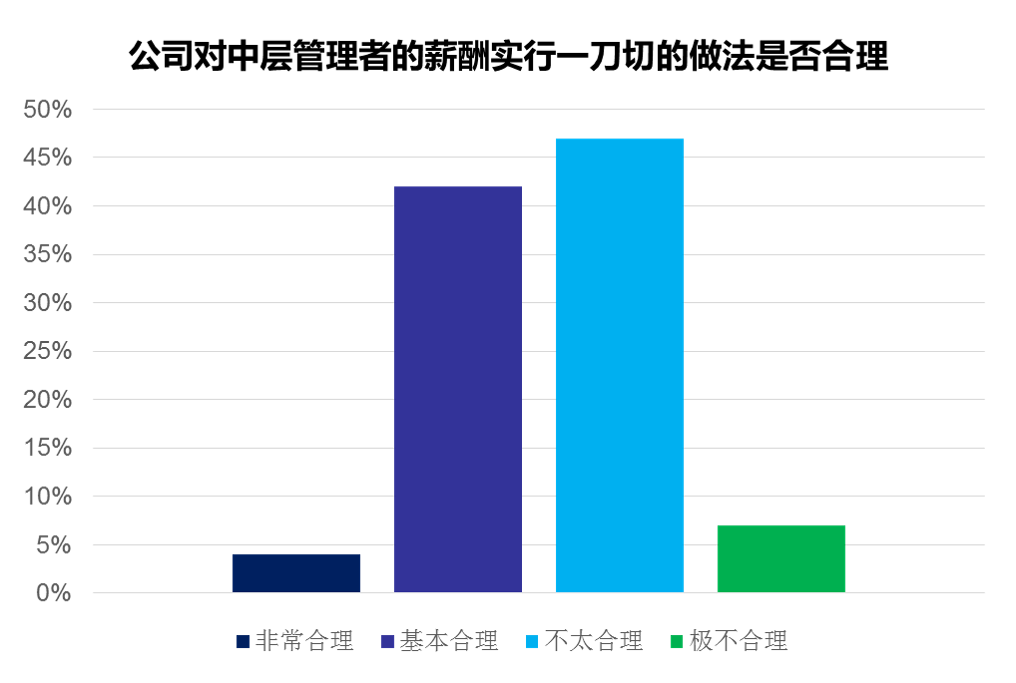 另外,调查显示,部分企业对不同岗位的中层管理者的薪酬水平也实行一刀切,忽略了不同职位序列的中层管理之间的岗位价值差异,数据显示47%的员工认为公司对中层管理的薪酬实习一刀切是不合理的,7%的人员认为是极其不合理的。