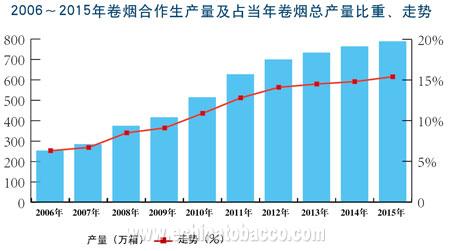 回顾行业合作生产工作,始终保持着稳定发展态势,有力支持了行业大品牌、大企业发展战略,行业整体竞争实力持续提升。特别是近十年来合作生产总量始终保持平稳发展态势,合作生产量占当年卷烟总产量比重持续提高,到2015年已经突破15%,达到15.4%。