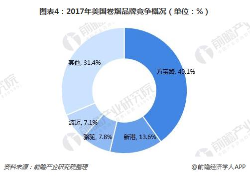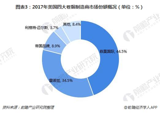 目前,美国市场上主要有四家大的卷烟制造商:菲莫国际、雷诺兹烟草公司、帝国品牌公司以及利格特•迈尔斯烟草公司。2017年,菲莫国际在美国的市场份额为44.5%,较上年下降了2.1个百分点;雷诺兹烟草公司的市场份额为34.5%,同比上升0.8个百分点;帝国品牌公司市场份额增长了0.1个百分点,至8.9%;利格特•迈尔斯烟草公司的市场份额增加了0.1个百分点,至3.7%。