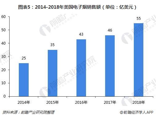 根据东方烟草发布的《2017年世界烟草发展报告》显示,北美是第一大电子烟市场,而跟据贝伦贝格银行发表的一份报告称,美国已经成为世界上新一代产品销量最大的市场。2014-2017年,美国电子烟销售额逐年增长,2017年增长至46亿美元。而2017年全球电子烟销售额约为100亿美元,美国就占了近50%的市场份额。预计2018年美国电子烟销售额将达到55亿美元。