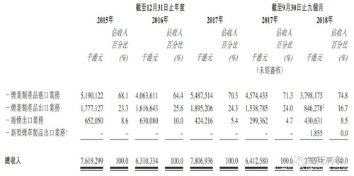 业绩方面,从2015年至2017年及2018年前三季度,中烟国际(香港)分别收入76.19亿港元、63.1亿港元、78.07亿港元及50.76港元,同期净利润分别达到了3.91亿港元、3.38亿港元、3.48亿港元及2.22亿港元,毛利率分别为7.4%、7.7%、6.3%及5.8%,与国内烟草零售业务相比,并没有想象中的“暴利”。