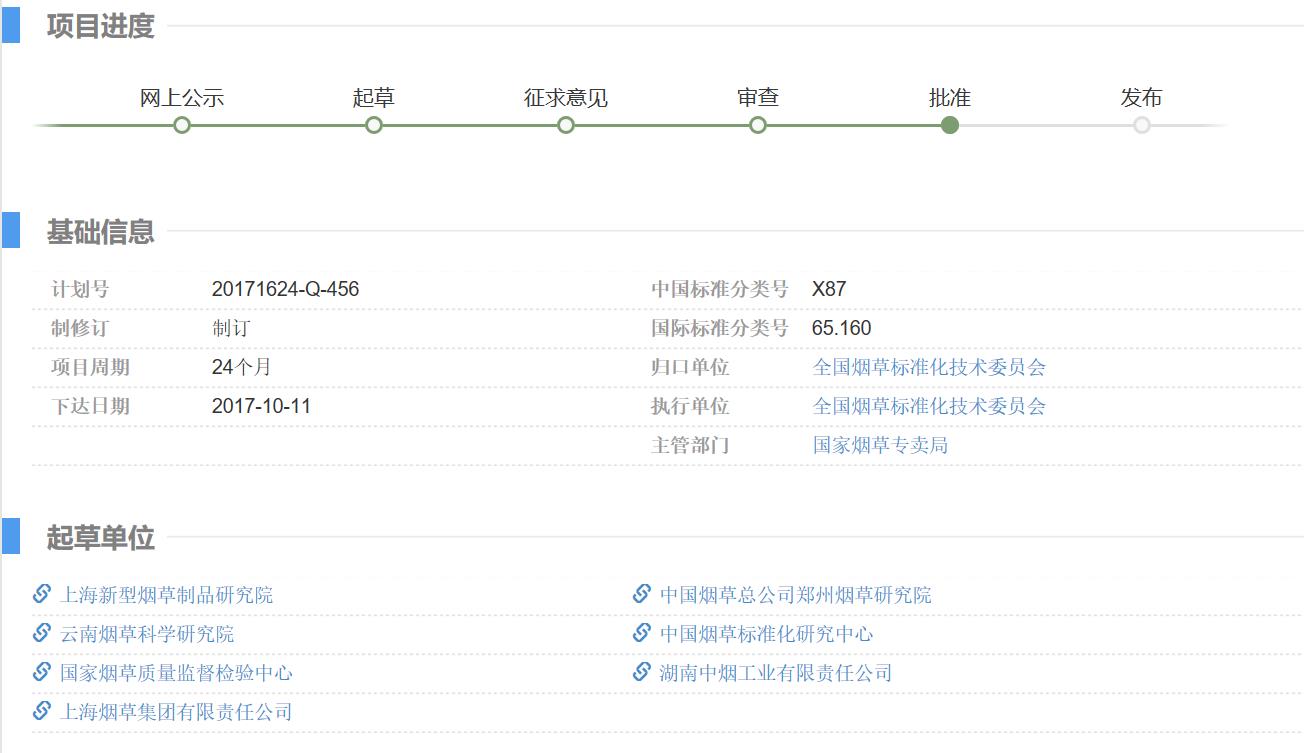 9月22日,蓝鲸产经在全国标准信息公共服务平台上看到,电子烟相关标准正在批准阶段,项目下达日期为2017年10月11日,项目周期为24个月,据此推算,在2019年10月11日将是电子烟标准计划出台的日期,故有此消息。当然,不排除相关标准的出台可能会延期。全球电子烟巨头雪加snow+首席产品官Justin Li向蓝鲸产经表示,对电子烟标准出台并不知情。RELX悦刻方面也表示不知情。一般行业标准出台前都会,都会与行业内主要企业内进行沟通,据此来看,电子烟标准能否按计划出台尚存疑虑。