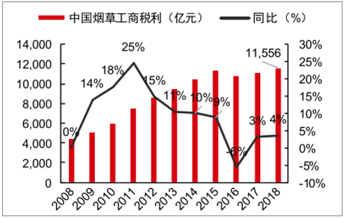 近年来,我国的经济发展由高速转变为了高质量发展阶段,2018年我国GDP为90.0309万亿元,同比增长了6.6%,城镇居民人均可支配收入达到了39251元,名义增长了7.8%。在我国经济的提升下,近年来,我国烟草行业的收入已经突破了万亿大关,2018年我国烟草行业利税收入为11556亿元,电子烟作为香烟的替代品,替代20%的香烟市场,电子烟行业的收入也能达到2000多亿元。
