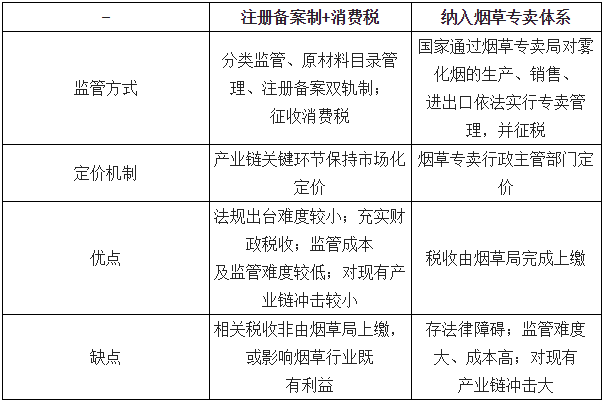 由于烟草行业每年给我国财政贡献了巨额的税收,因此我国在电子烟的领域并没有法律属性的明确规定。但是在国家发布的一些文件中,电子烟可以类比为烟草制品,接受相关法律法规的管理。目前来看,国家和地方政府发布的《关于加强烟草专卖市场监管工作的通知》、《国家市场监督管理总局国家烟草专卖局关于禁止向未成年人出售电子烟的通告》、《杭州市公共场所控制吸烟条例》、《烟草控制框架公约》等文件,均提到了电子烟的销售和管理。