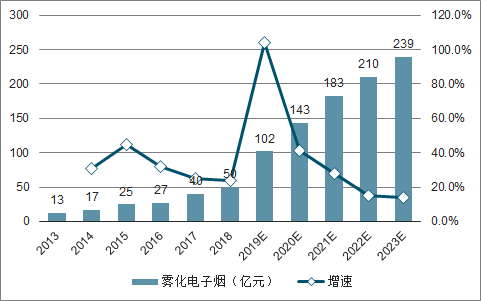 2013-2023年中国雾化电子烟市场规模及同比预测
