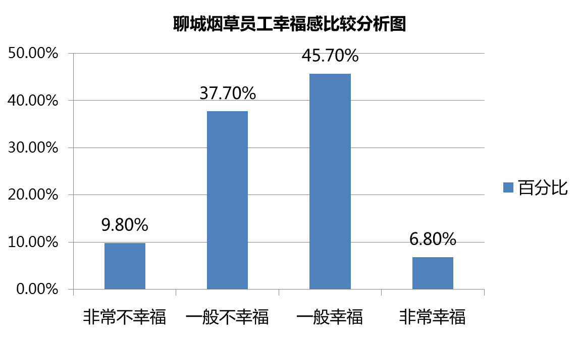 根据相关数据分析可知,聊城烟草员工的幸福指数比较高。其中,员工认为比较幸福的占总体幸福程度的45.70%;感到非常幸福的占6.80%。但是,仍然有大部分员工的幸福感不高,认为自己一般不幸福的占37.70%;认为自己非常不幸福为9.80%。烟草行业员工的整体幸福水平相对其他大部分行业员工的幸福指数偏高。由于还有不少员工认为自己不是很幸福的,所以在工作过程中,对员工的激励机制部分还存在改善空间,提高员工的幸福感。