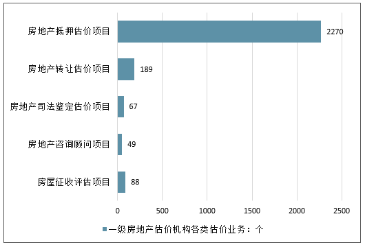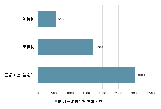 目前,我国房地产评估业务按照内容来划分,主要包括房地产抵押/转让评估、司法鉴定、征收评估、咨询顾问、土地使用权转让评估等。目前,全国共有房地产评估机构约5250家,其中一级机构约550家,二级机构约1700家,三级(含暂定)机构约3000家;注册执业人数约为5.4万人。