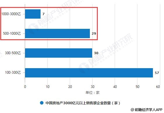 《排行榜》显示,销售额在3000亿元以上的房企有7家、1000亿~3000亿元29家、500亿~1000亿元29家、300亿~500亿元30家、100亿~300亿元57家。