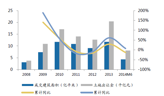 2014年1-6月,300城市住宅用地成交建筑面积合计4.32亿平米(累计同比-13%),其中,一线城市1450万平米(累计同比+26%),二线城市1.45亿平米(累计同比-14%), 三四线城市2.72亿平米(累计同比-13%)。