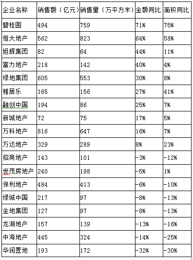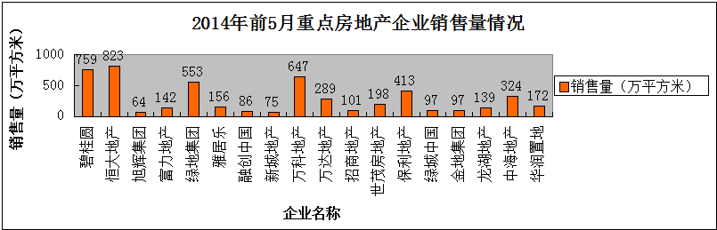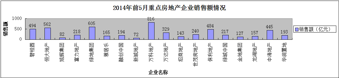 2014年前5月,超过半数的房企销售业绩保持增长。典型房地产企业的销售金额为5543亿元,同比增长12.22%;销售面积5134万平方米,同比增长11.67%。同时,多家房地产企业的销售金额出现下降,其中华润置地、中海地产、龙湖地产这三家企业销售金额同比分别下滑32%、14%和13%。