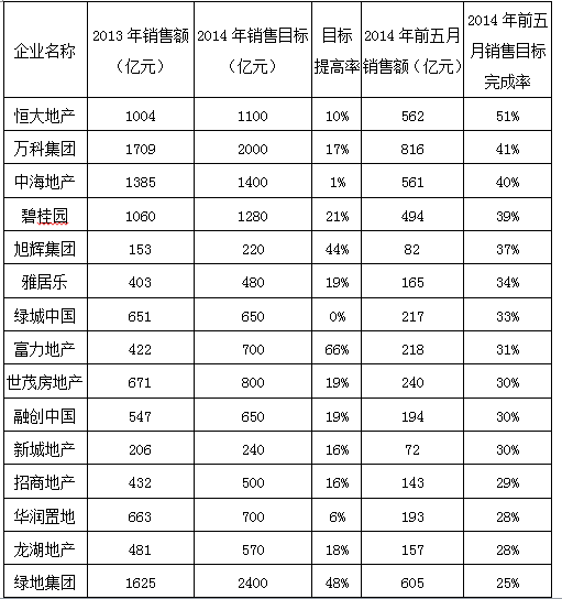 表2:2014年前五月重点房地产企业销售目标完成情况表