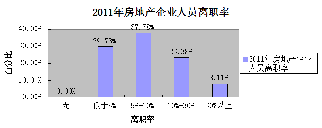 根据调查研究表明:2011年房地产企业离职率低于5%的企业只有29.73%,离职率处于5%-10%的企业占33.78%,离职率处于10%-30%的企业占28.38%,其中还有8.11%的个别企业的离职率超过30%。总体来看,2011年,房地产企业离职率偏高,60%的企业离职率超过5%。