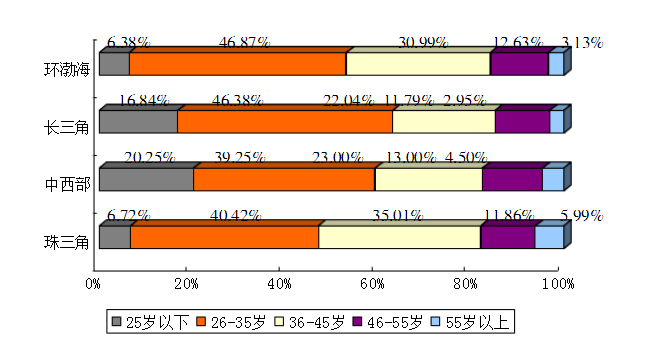 调查研究结果表明:中国房地产人员构成较为年轻,以26-35岁为主,占43.23%左右,大多房地产企业拥有一支年轻的核心团体。