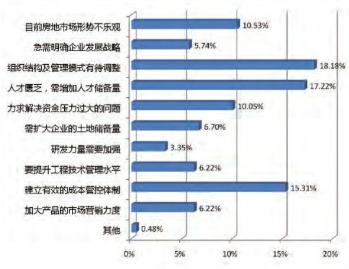 根据相关数据研究表明,我国房地产企业进一步发展,人力资源这一大块面临的问题主要集中在组织结构与管理模式不合理、人才匮乏等方面。