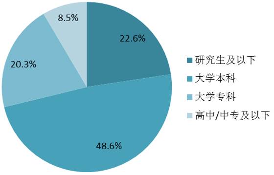 调查结果表明,我国房地产人员学历水平较高,大专学历及其学历以上占91.5%,其中大学专科占20.3%,大学本科占48.6%,为主要构成部分,但是研究生及以上的相对还是偏低,只占22.6%。
