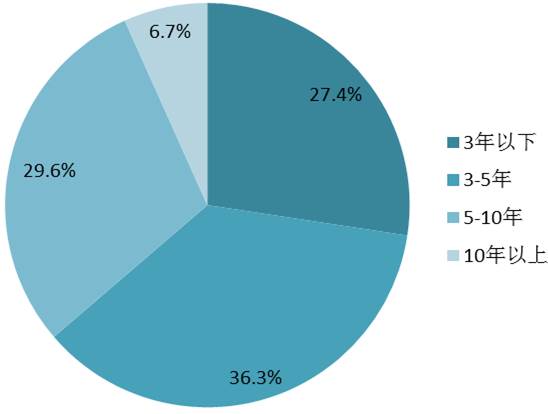 调研结果显示:中国房地产开发企业人员从业年限普遍较短。5年工作经验以下的占了63.7%,其中3年以下工作经验的占27.4%,3-5年工作经验的36.3%。但是,从业10年以上的员工只有6.7%,行业整体经验值较低。