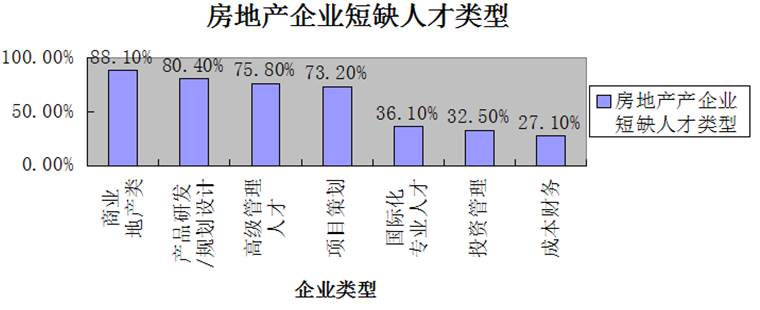 调查研究表明:房地产企业的商业地产类、产品研发、规划设计、高级管理人才、项目策划、国际专业化人才、投资管理、成本财务的人才极度缺乏,尤其是房地产企业的商业地产类、产品研发、规划设计、高级管理人才,都在70%以上。