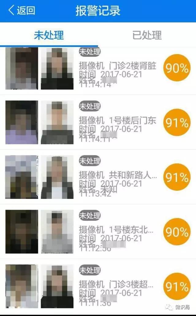 从第二张截图我们可以看出,遍布医院及医生诊室内的摄像头一旦监控到人像和系统内医药代表照片相符,即报警提示,等候下一步处理,基本每个医药代表医院活动情况均会被捕获,而从本图里第三个报警记录显示位置看,不仅在院内,哪怕你刚走在医院门口共和新路即被摄像头捕获,马上进行对比。