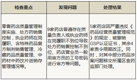 少数药店存在管理制度不够健全,处方药未凭医师处方销售,含麻黄碱类复方制剂销售记录不规范和执业药师(驻店药师)不在岗等问题,针对检查发现的问题,检查人员现场责令限期整改,宣传于警示有机结合,要求经营者做到自觉自律规范经营。