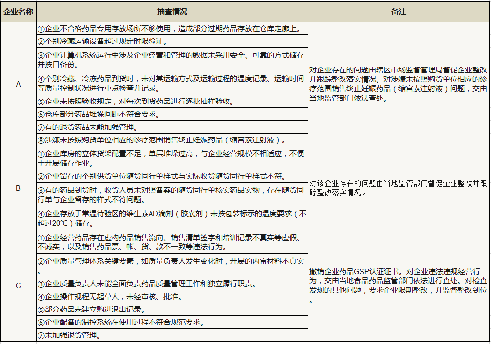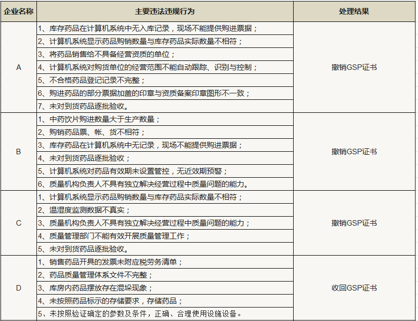 近日,湖南、福建、甘肃、山西、四川等多地药品经营企业被检查,或被撤销GSP证书,或被收回GSP证书,或被要求限期整改,其中,发现的主要问题如下:执业药师在岗履职不到位导致处方药销售控制不到位,销售药品票、帐、货、款不一致,企业配备的温控系统在使用过程不符合规范要求,仓库部分药品堆垛间距不符合要求,未对到货药品逐批验收等等,具体情况如下: