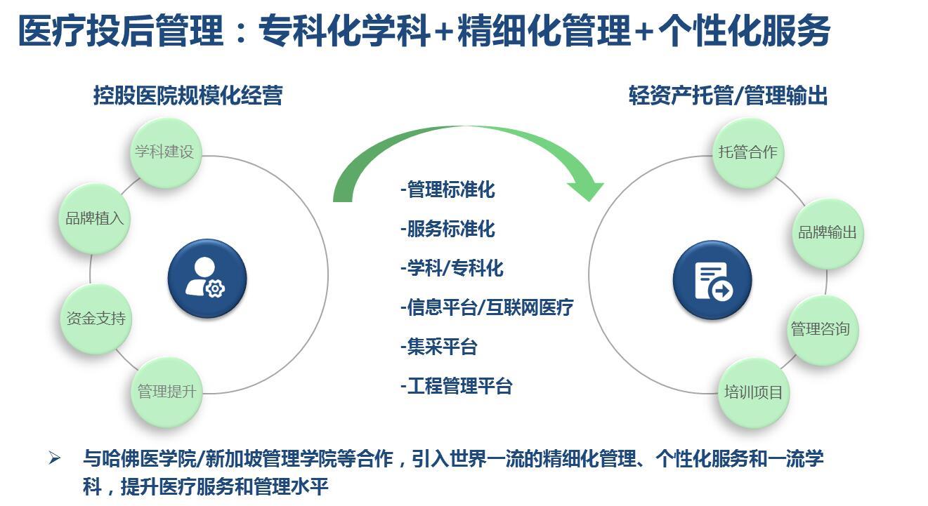 为此,北大医疗做出了一个重要决策:在医疗服务规模化发展基础上形成医院管理输出能力,打造具有"北大医疗系"的标准化体系,实现可复制、可转移、可输出的医疗服务。北大医疗设置的医院投后管理专业化方向包括,医疗信息化管理、运营管理、品质管理、创新资源引入等。据悉,围绕以上发展方向,均有相关项目在推进。