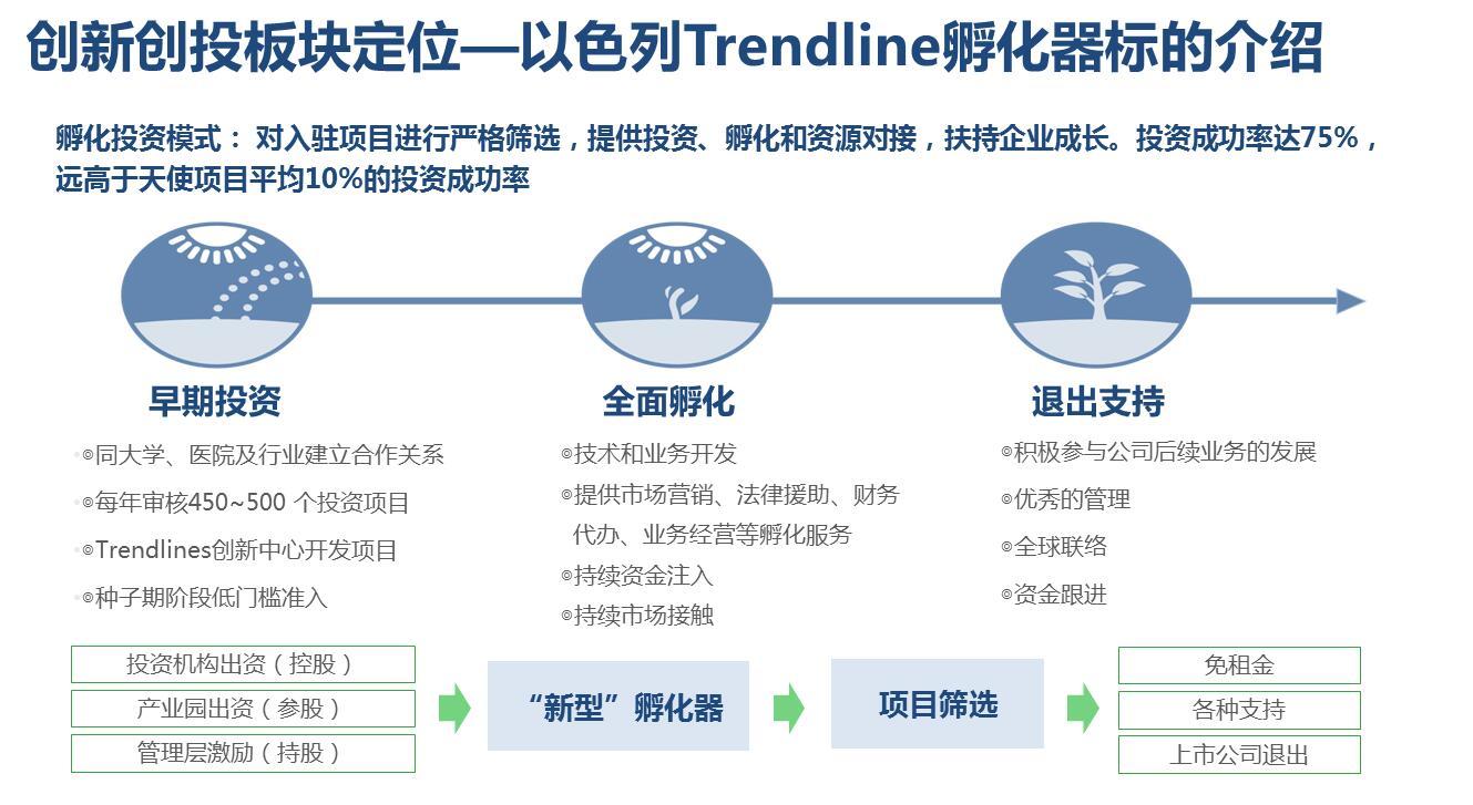 据宋金松介绍,北大医疗创新创投板块以以色列Trendline孵化器为标杆,其孵化投资模式为对入驻项目进行严格筛选,提供投资、孵化和资源对接,扶持企业成长,提供市场营销、法律援助、财务代办、业务经营等孵化服务;持续资金注入、市场接触等方面提供帮助,孵化成功后,在后续业务发展、管理、联络、资金跟进等方面,给予退出支持。