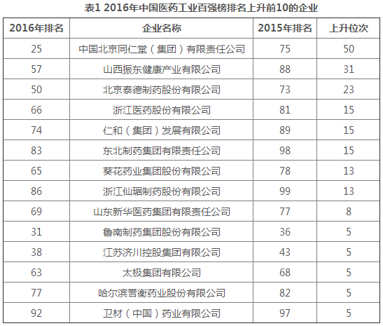 从企业排名变动情况来看,2016年医药工业百强榜单中有39家企业排名上升,39家企业排名下降。榜单中前七名的企业继续维持去年位次,扬子江药业集团有限公司、广州医药集团有限公司、修正药业集团股份有限公司继续分列前3位。在排名上升的企业中,共有8家企业上升位次超过10位,其中中国北京同仁堂(集团)有限责任公司的排名上升最快(上升50位)。本次榜单中,华立医药集团有限公司、吉林敖东药业集团股份有限公司、安斯康来制药(中国)有限公司、成都康弘药业集团股份有限公司、黑龙江珍宝岛药业股份有限公司及乐普(北京)医疗器械股份有限公司等6家企业首次晋级百强企业,其主营业务收入平均增速(18.7%)比百强企业总体主营业务收入平均增速高7.6个百分点。