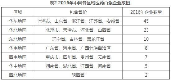 从百强企业区域占比来看,华东地区是我国拥有医药工业百强企业最多的地区,2016年共拥有百强企业45家,相关企业主营业务收入规模占百强企业总体主营业务收入规模的44.4%。但从百强企业区域分布情况看,我国医药工业已呈现出由东南沿海向内陆转移的趋势。本年度榜单中,华北地区、东北地区及西南地区拥有百强企业的数量均有所增加,其中华北地区拥有百强企业23家,较2015年增加2家;东北地区拥有百强企业10家,较2015年增加4家;西南地区拥有百强企业7家,较2015年增加1家。