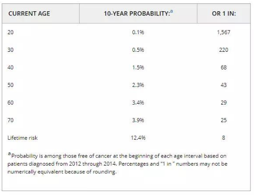 据估计,美国女性在其一生中被诊断出患有乳腺癌的风险为12.4%,即每八位女性中就有一个被诊断为乳腺癌。同时,根据10年癌症发展的年龄特异性来说,对于50岁,未被诊断出患有癌症的女性来说,她在未来10年被诊断为乳腺癌的风险为2.3%。