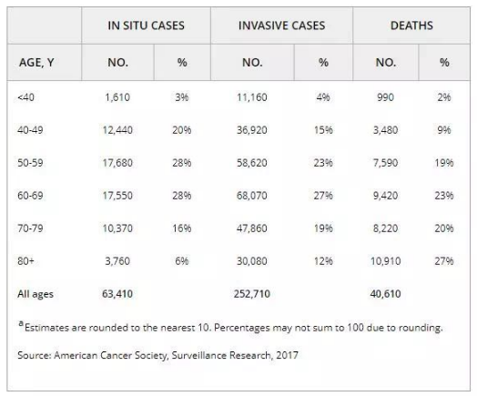 美国癌症协会预计在2017年,美国将有大约252,710个新侵袭性乳腺癌病例和63,410个原位乳腺癌病例。此外,其预计将有40,610名女性死于乳腺癌。而在50岁及以上的女性中,有81%的乳腺癌被诊断出来,并有89%的乳腺癌死亡发生在50岁及以上的女性中。乳腺癌患者的诊断年龄中位数为62岁;黑人女性(59岁)的诊断年龄中位数比白人女性(63岁)年轻。乳腺癌死亡的平均年龄为68岁(白人女性为70岁,黑人女性为62岁)。
