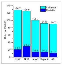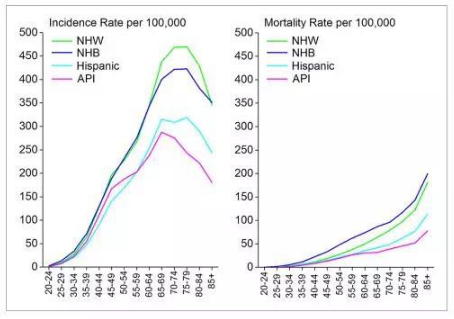 在美国,女性乳腺癌的发病率和死亡率有很大的差异。非西班牙裔白人(NHW)和非西班牙裔黑人(NHB)妇女的乳腺癌发病率和死亡率高于其他种族/民族的妇女;API妇女的发病率和死亡率最低。虽然整体的乳腺癌发病率在2010年到2014年NHB女性比NHW女性(125.5 100000)(128.7 100000) 略降2%。但在2011年到2015年期间,NHB女性的乳腺癌死亡率比NHW女性高出了42%(29.5 100000)(20.8 100000)。而数据也显示乳腺癌发病率的差异随年龄而异。与NHW妇女相比,NHB妇女在40岁之前有较高的乳腺癌发病率,但在65岁至84岁时发病率较低。但是纵观每个年龄段,NHB女性更有可能死于乳腺癌。