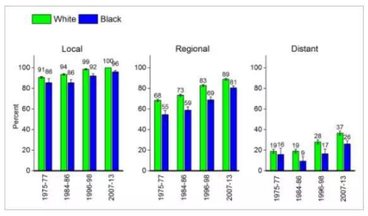 2016年1月1日,美国有350多万乳腺癌患者存活。从1975年到1977年和2007年到2013年,乳腺癌在5年相对生存率上的变化趋势。在黑人妇女和白人妇女中,每一阶段的疾病都有显著的生存率。对于那些患有区域阶段疾病的患者来说,生存率的最大提高是在白人女性中:从68%上升到89%,黑人女性从55%上升到81%。
