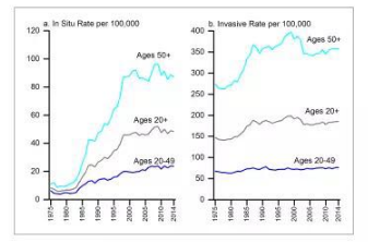 根据以往的数据研究人员得出了有关2017年侵入性和原位乳腺癌病例以及乳腺癌死亡总数的估计数字。而根据NAACCR分析文件中2010年至2014年期间每个年龄组诊断的病例比例,计算出了2017年按照年龄确诊的病例数及 2017年侵袭性和原位乳腺癌估计病例总数。同时,通过计算2011年至2015年期间在每个年龄组中发生的死亡人数,估计了2017年乳腺癌死亡总人数的比例。