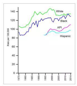 按种族:黑人女性逐步上升,白人女性有所回落。