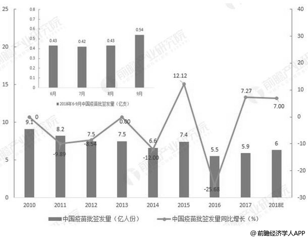 2018年10月,长生生物疫苗造假事件终于尘埃落定,以91亿巨额罚款以及退市结尾,但疫苗行业的监管趋严已经不可避免的。据前瞻产业研究院发布的《中国疫苗行业深度调研与投资战略规划分析报告》统计数据显示,2010-2017年,中国疫苗批签发量整体呈现下降趋势,增速波动较大。但可以看出,2017年中国疫苗批签发量为5.9亿人份,较上年有所增加,2018年前三季度,我国疫苗批签发量总计4.27亿人份,9月份增幅明显,行业出现回暖的趋势。预计2018年我国疫苗批签发量将达6亿人份。