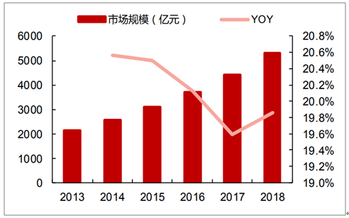 2018年国内医疗器械市场总规模约5304亿,同比增长19.86%,2014-2018年复合增速为20.02%,大幅高于全球医疗器械市场约5%的增速,同时高于2018国内药品终端市场6.28%的增速。在药品和器械合并市场中,医疗器械占比从2013年的16.18%增长到2018年的23.64%。在创新器械审评加速等政策推动下,医疗器械行业保持快速稳定增长。